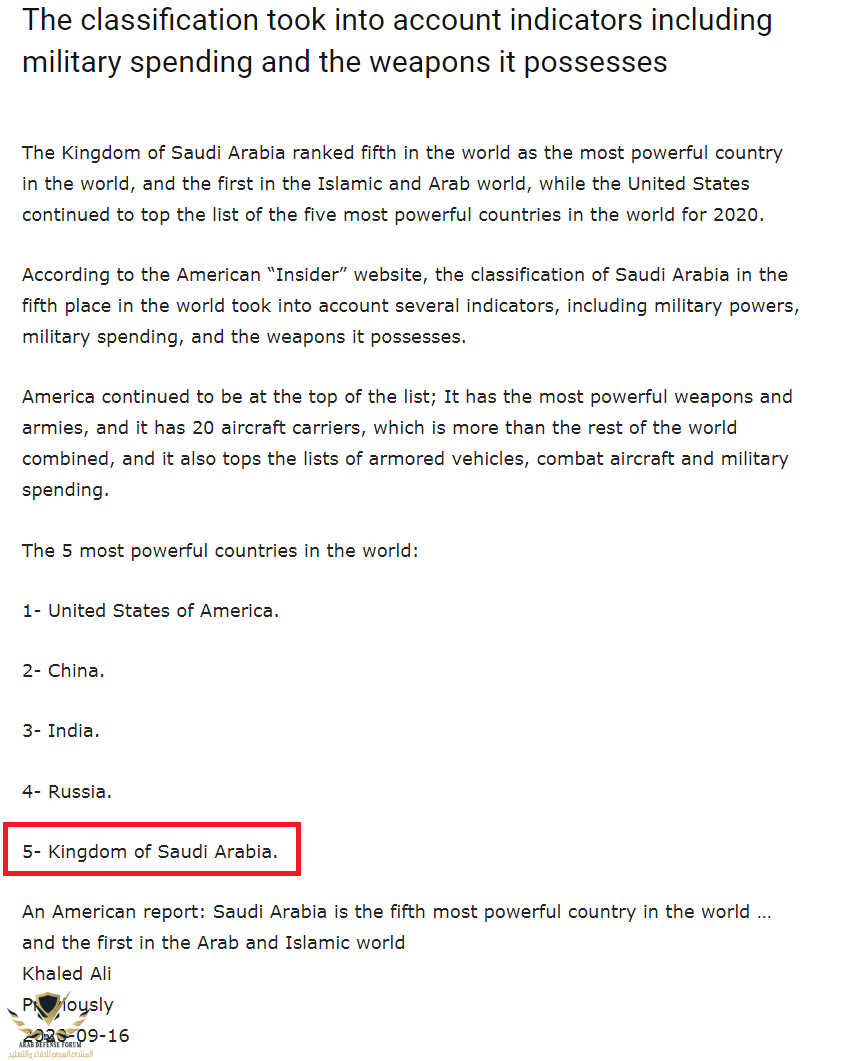 تقرير أمريكي السعودية خامس أقوى دولة في العالم والأولى عربي ا وإسلامي ا Defense Arab المنتدى العربي للدفاع والتسليح