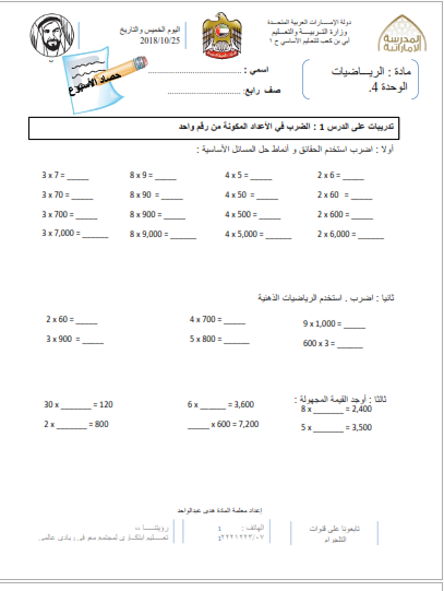 اوراق عمل رياضيات للصف الرابع مع الشرح